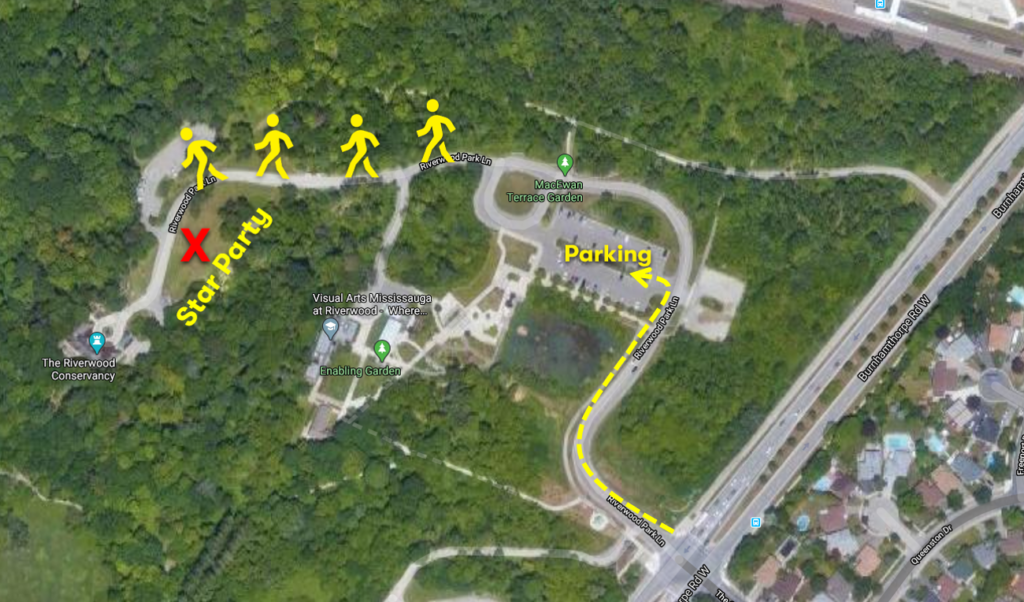 Turn off of Burnhamthorpe Road West onto Riverwood Park Lane.  Park anywhere in the main parking lot and walk (wheelchair accessible) on the lane to The Riverwood Conservancy building.  The telescopes will be set up in the field across from the Concercancy building.